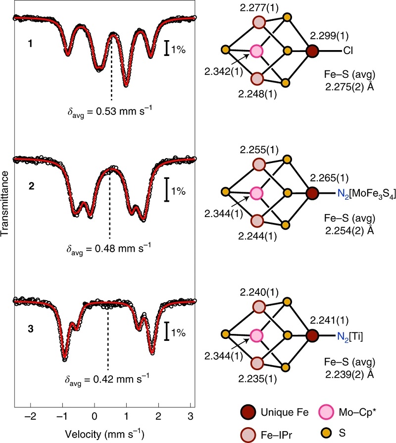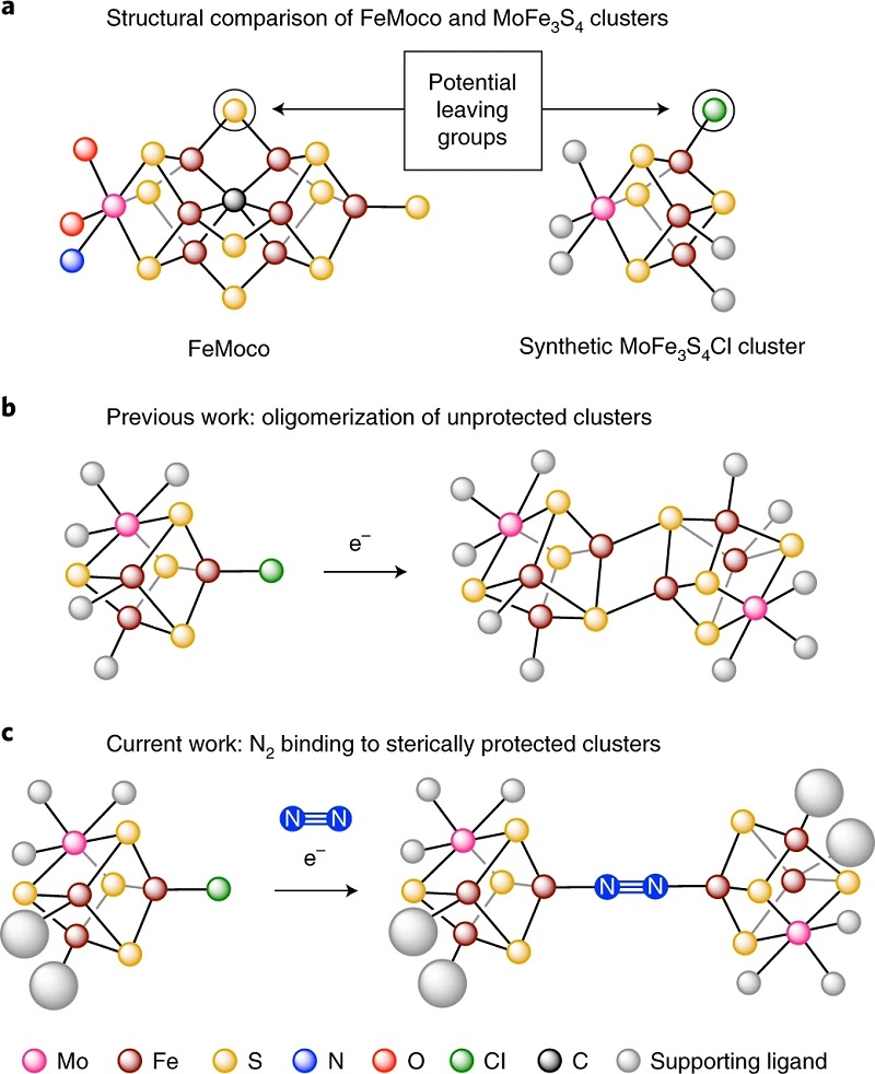(a)FeMoco的潜在离去基团与合成的[MoFe3S4Cl]簇之间的类比,这些簇可能暴露出N2结合位点;