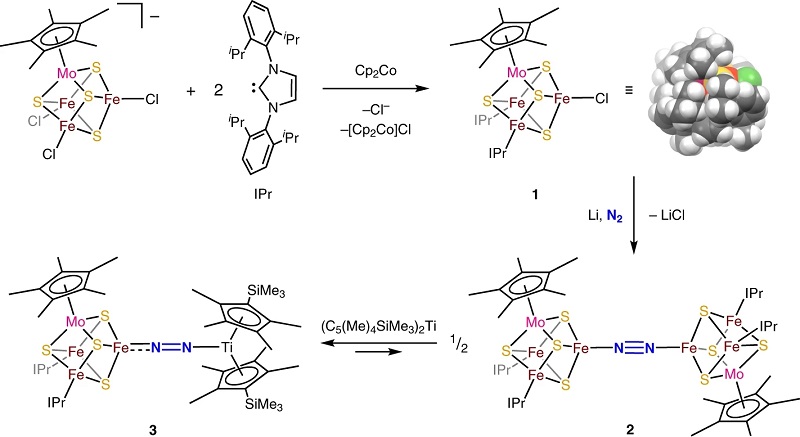 图一、在合成的[MoFe3S4]簇上结合N2的策略