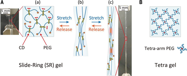 (A)由CDs组成的可移动交联SR凝胶。PEG的密堆积结构在拉伸和释放过程中形成和破坏。
