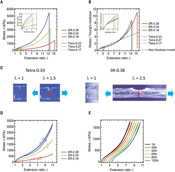 (C)Tetra-0.33和SR-0.38单边缺口试样在拉伸前(左)和在拉伸下裂纹开始扩展后(右)的照片。蓝色和红色箭头分别表示拉伸和裂纹扩展的方向。白色比例尺代表 1 mm。