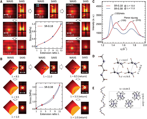 (A,B)SR-0.18 (A) 和 SR-0.38 (B) 在加载-卸载循环期间的WAXS和SAXS图。白色双箭头表示拉伸方向。