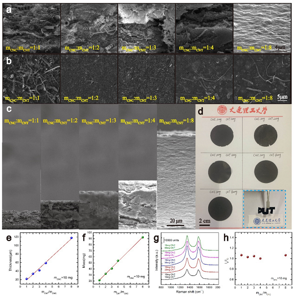 图1. 不同质量配比的CNC-CNT巴基纸的形貌表征及基本物理性能。(a)横截面SEM图;(b)表面SEM图;(c)厚度对比;(d)自支撑CNC-CNT巴基纸的实物图,其中插图为具有“DUT”图案的自支撑巴基纸实物图;(e)薄膜厚度与CNCs-CNTs质量配比之间的关系;(f)薄膜总质量与CNCs-CNTs质量配比之间的关系;(g)不同巴基纸的拉曼光谱图;(h)不同巴基纸拉曼光谱的D峰、G峰强度比统计。