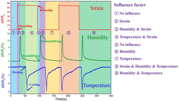随着5G时代的来临,人工智能、人机交互、电子皮肤等前沿领域受到了极大的关注。并且,随着新冠肺炎的全球蔓延,人们对于自身生理信号的实时监测越来越重视。因此,能够精确探测诸如脉搏、血压、心跳、呼吸等生理信号的功能已经成为了智能健康设备不可缺少的功能。作为智能设备的重要组件之一,柔性多功能传感器的研发成为了传感领域的研发热点。特别是对于形变、温度、湿度这些与人们生活息息相关的外界信号的实时探测自然成为了传感器中的重要功能。