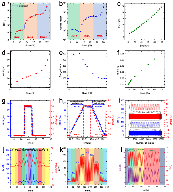 图2. 以CNC(10 mg)-CNT (30 mg)巴基纸为传感介质的应变传感器的应变传感性能。在1-100%的应变范围内,(a)电阻变化(b)应变灵敏度以及(c)拉力,这三个参量与应变量之间的关系;在0-1%的小应变范围内,(d)电阻变化(e)应变灵敏度以及(f)拉力与应变量之间的关系;(g)“拉伸-保持-回复”过程中的电阻变化情况;(h)图2g中的拉伸响应时间与回复响应时间;(i)10000次循环应变测试;(j)台阶拉伸测试;(k)相同应变速度不同应变量以及(l)相同应变量不同应变速度的传感性能测试。