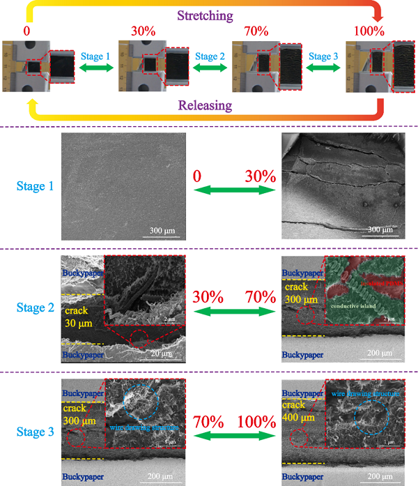 对应变过程中的碳纳米线圈-碳纳米管复合薄膜进行原位电镜观测(图3),发现在应变过程中薄膜内部会形成宽达数百微米的可恢复导电裂缝,桥接于裂缝两端的碳纳米线圈以及裂缝之间“拔丝状”的碳纳米管保证了该薄膜的导电通路在大应变下依然完整,从而使得应变传感兼顾了宽应变范围与超高灵敏度的性能优势。