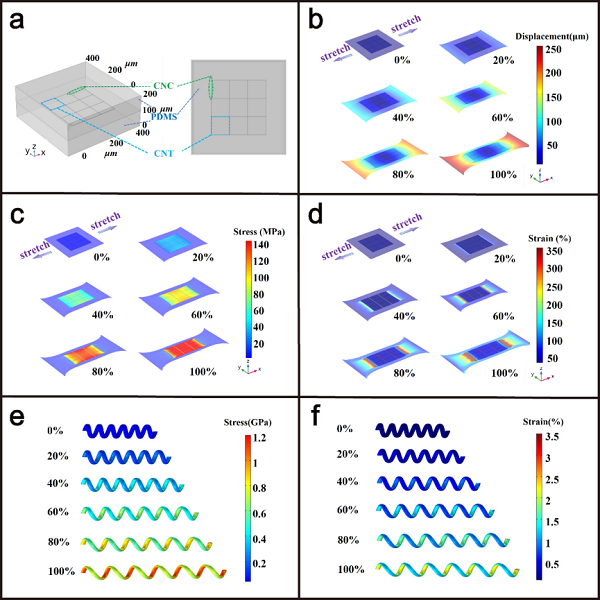 图4. 拉伸过程中,应变、应力以及位移分布情况的有限元模拟。(a)CNC-CNT巴基纸的模型图;(b)-(d)CNC-CNT巴基纸的位移、应力、应变分布情况;(e)-(f)单根CNC的应力、应变分布情况。