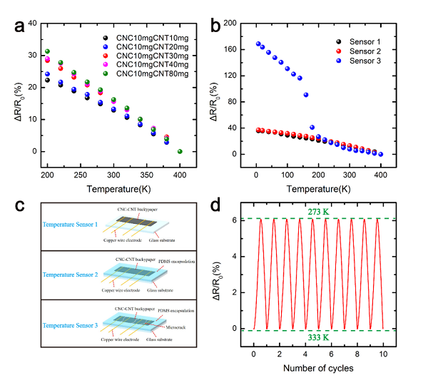 图5. CNC-CNT巴基纸传感器的温度传感性能。(a)不同配比的巴基纸传感器的温度-电阻关系;(b)以CNC(10 mg)-CNT (80 mg)巴基纸为传感介质、具有不同结构的传感器的温度传感性能对比;(c)不同温度传感器的结构示意图;(d)循环温度传感测试。