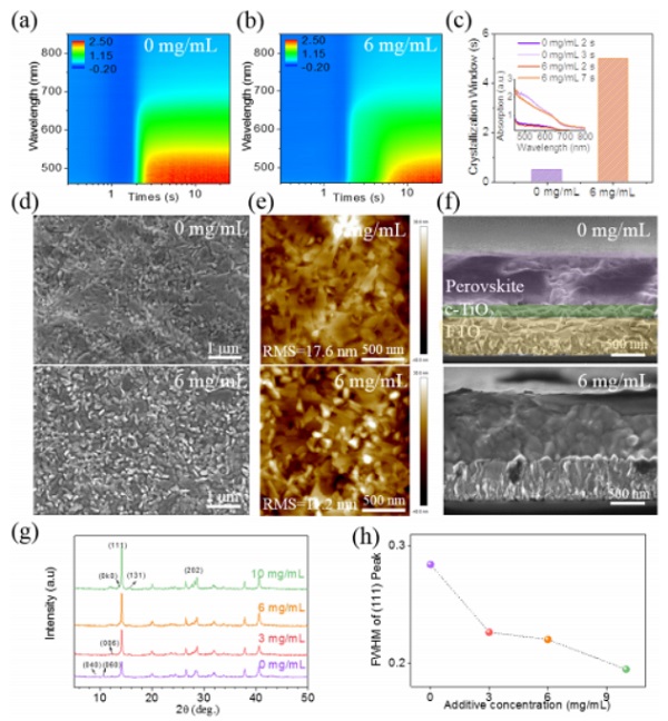 a,b) 使用和不使用 MACl 沉积过程中二维 (BDA)(MA)n-1PbnI3n+1 (<n>=4) 钙钛矿薄膜的原位紫外-可见吸收光谱 c) 有和没有 MACl 的 2D (BDA)(MA)n-1PbnI3n+1(<n>=4) 薄膜的结晶窗口 d-f) 对照和优化薄膜的平面扫描电子显微镜 (SEM) 图像、原子力显微镜 (AFM) 图像和横截面 SEM 图像 g-h) X 射线衍射 (XRD) 图案和具有各种添加剂浓度的薄膜的 (111) 衍射峰的 FWHM