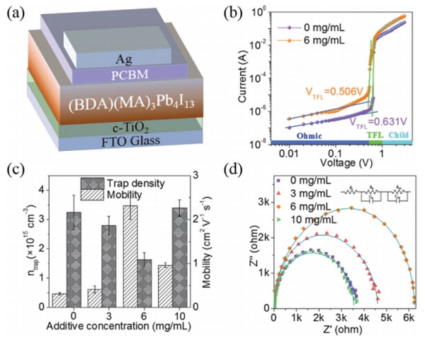 a) 完整太阳能电池的器件结构b) 用于控制和优化薄膜的纯电子器件的暗 I-V 测量的比较 c) 不同 MACl 浓度薄膜的陷阱态密度和电子迁移率 d) 具有不同 MACl 浓度的器件的电阻抗谱 (EIS) 数据