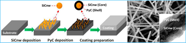 图 18. C/C-ZrB2-ZrC-SiC基材上SiCNW@PyC核壳结构增韧SAPS-ZrB2-ZrC涂层制备示意图(左),SiCNW@PyC核壳结构SEM/TEM形貌(右)