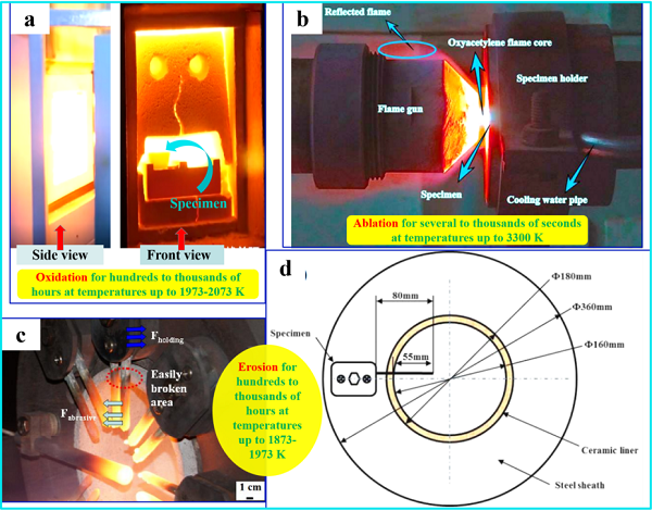 图 3 复合材料实验室高温氧化(a)和烧蚀(b试验,以及风洞冲蚀试验(模拟真实的使用环境)(c)(相应的试验装置图见(d))