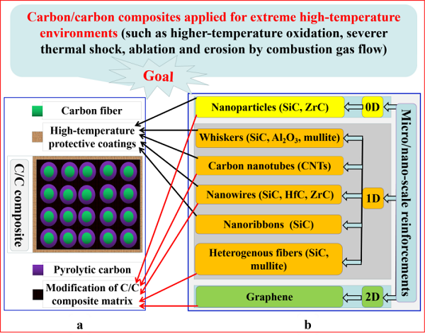 图 4. (a)复合材料普适防护方法(包括(1)基体改性和(2)高温防护涂层),(b)有望应用于极端高温环境(例如高温氧化,更剧烈的热冲击,燃烧气体燃烧引起的烧蚀和腐蚀)用碳碳复合材料的微/纳米多尺度增强体。其中红色箭头表示增强碳碳复合材料,黑色箭头表示增韧涂层