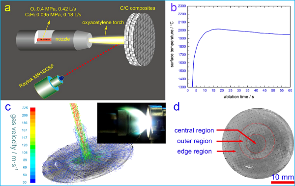 图 25. (a)烧蚀装置示意图、(b)烧蚀过程中材料表面温度随烧蚀时间的变化、(c)利用Ansys Fluent软件模拟的烧蚀过程的热流场和(d)速度场对C/C表面不同区域形貌的影响
