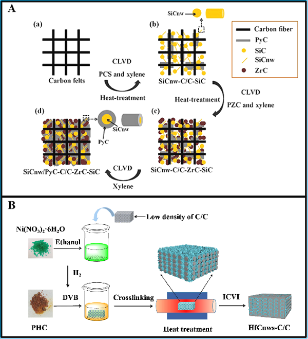 图 32. SiCNWs@PyC-C/C–ZrC–SiC(A)和HfCNWs-C/C(B)复合材料制备工艺示意图