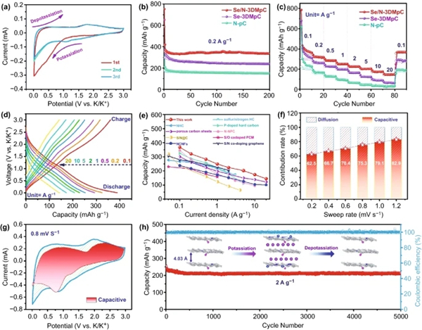 (g)在0.8 mV s-1时,Se/N-3DMpC电极的电容贡献;