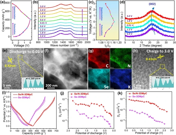 (j,k)GITT在钾化和脱钾过程中计算的Se/N-3DMpC和Se-3DMpC的K离子扩散系数。