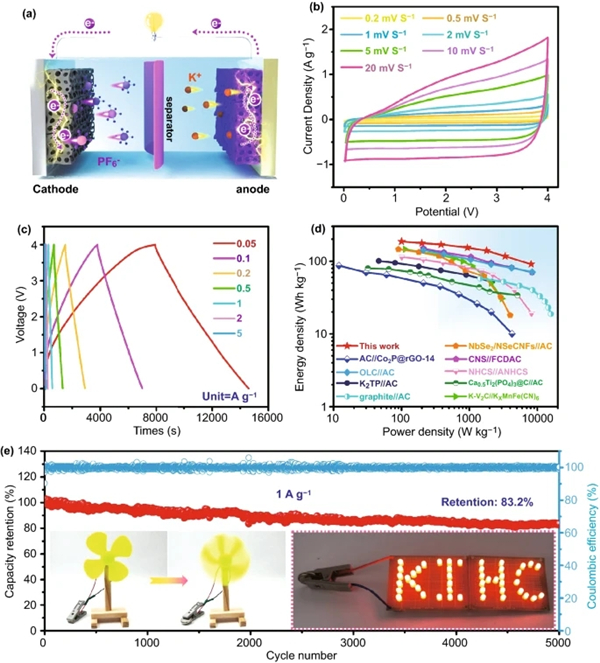 近日,中国科学院福建物质结构研究所温珍海和Xiang Hu(共同通讯作者)等人基于密度泛函理论计算的预测,发现Se/N共掺杂多孔碳是一种很有前途的K+存储候选材料,因此开发了一种简单通用的牺牲模板方法来制备Se和N共掺杂的三维(3D)大孔碳(Se/N-3DMpC),其具有良好的连通性分级孔、扩展的层间结构和丰富的活性位点,可提高对K+存储负极的赝电容活性和动力学,并增强可逆阴离子吸附/脱附的正极电容性能。正如预期的那样,组装好的PIHCs全电池工作电压高达4.0 V,可提供186 Wh kg-1的高能量密度和8100 W kg-1的功率输出以及出色的长使用寿命。具有优异性能的碳材料为高性能混合电容器的开发和应用开辟了新途径。相关成果以“A General Self-Sacrifice Template Strategy to 3D Heteroatom-Doped Macroporous Carbon for High-Performance Potassium-Ion Hybrid Capacitors”发表在Nano-Micro Letters上。
