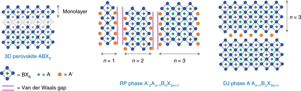 非层状ABX3、层状RP相A’2An−1BnX3n+1或DJ相A’An−1BnX3n+1的钙钛矿的一般结构示意图。这里显示了n = 1、2和3的情况,但n可以一直到5。
