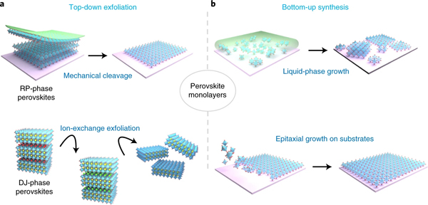 a)通过机械解理(顶部)和离子交换剥离(底部)的体块层状钙钛矿晶体的自上而下分层策略。