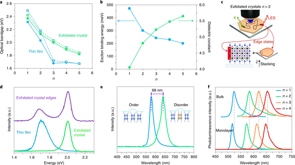 a)从吸收(空心符号)和光致发光实验(实心符号)中提取的光学带隙作为n的函数,在 (BA)2(MA)n-1PbnI3n+1薄膜和剥落薄片中。