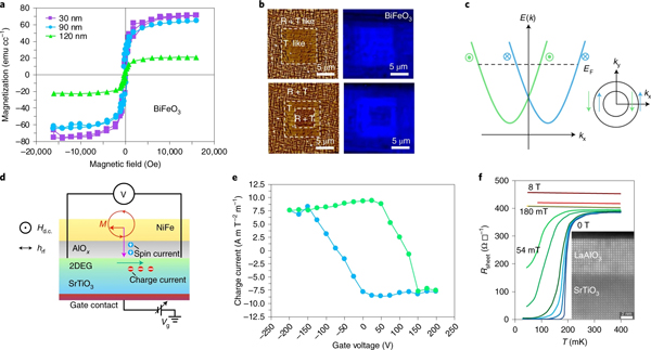 f)不同磁场下薄片电阻 (Rsheet) 随温度(T)的变化。插图显示了LaAlO3和SrTiO3薄层之间的异质界面。