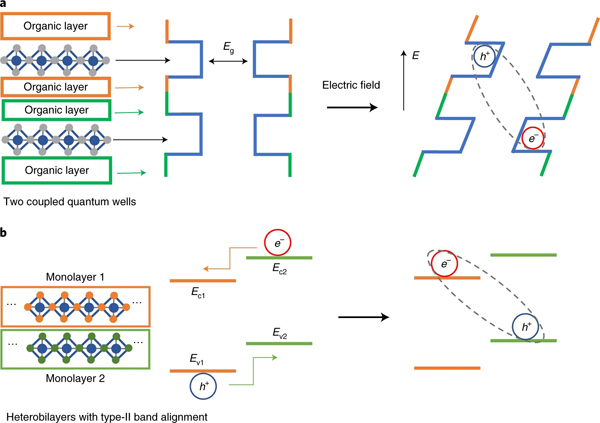 a)两个有机-无机杂化钙钛矿层堆叠示意图。当施加垂直电场时,电子和空穴将位于不同的量子阱中,形成层间激子。Eg是带隙能量。