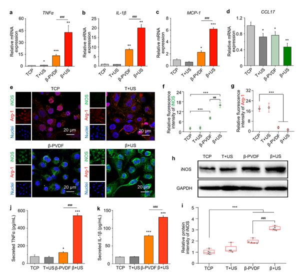 PCR结果证实,超声刺激条件下β-PVDF薄膜上巨噬细胞的促炎标记物肿瘤坏死因子-α(TNF-α)、白介素-1β(IL-1β)和单核细胞趋化蛋白1(MCP-1)的基因表达水平相对细胞爬片、细胞爬片加超声和β-PVDF薄膜对照组具有显著提高。免疫荧光染色和Western blot都表明细胞内的培养超声刺激条件下β-PVDF薄膜上巨噬细胞诱导型一氧化氮合酶(iNOS)的表达水平相对其他组最高。ELISA实验也证实了超声刺激条件下β-PVDF薄膜上的巨噬细胞具有最高的TNF-α和IL-1β分泌水平。