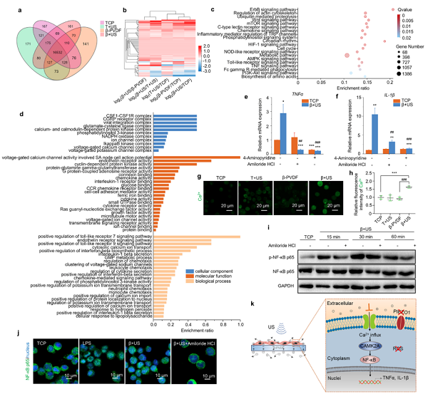 基于RNA测序分析,超声过程中促进了一系列电压门控离子通道相关的基因表达和生物学进程。压电材料在超声条件下产生的电信号引发通过电压门控钙离子通道的钙离子内流,并促进CAMK2A的上调,从而促进NF-κB的入核并诱导促炎因子的表达。而超声过程同时伴随产生的机械力信号和活性氧在这一过程中不起促进作用。