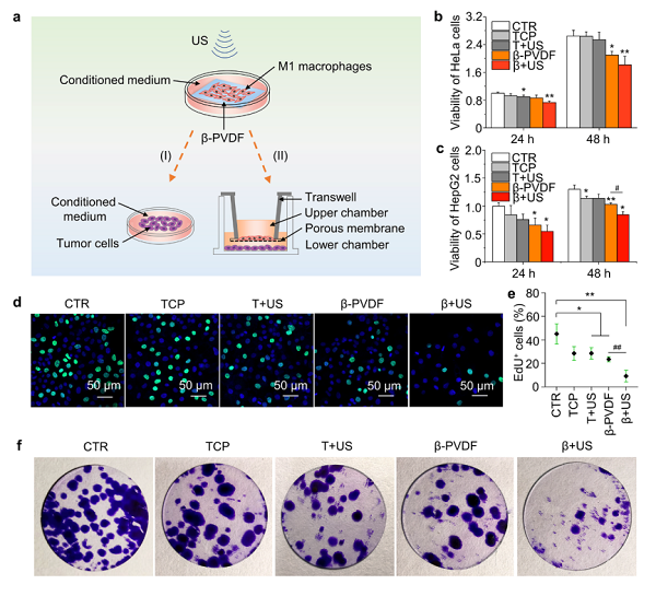将巨噬细胞的条件培养基与肿瘤细胞的培养基混合处理肿瘤细胞,发现超声刺激条件下β-PVDF薄膜上的巨噬细胞会通过分泌抗肿瘤细胞因子抑制HeLa细胞和HepG2细胞的活性。在Transwell共培养系统中,把巨噬细胞培养在小室中,肿瘤细胞培养在下层,EdU和克隆形成实验均表明超声刺激条件下β-PVDF薄膜上极化后的巨噬细胞具有最强的抗肿瘤效应,抑制了HepG2细胞的活性和增殖。