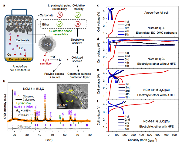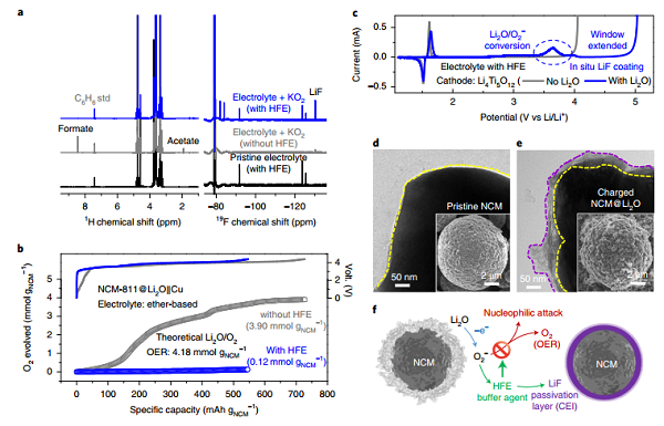 为了取代了典型的碳酸盐,本文采用了特殊改性的醚基电解液,以进一步提高阳极锂金属电镀/剥离的可逆性。为了延长使用典型纳米电池阴极的全电池的氧化稳定窗口,引入了Li2O,并将其与纳米电池阴极耦合。Li2O在预充电过程中起到牺牲剂的作用。氧化分解后,Li2O中的Li离子被镀到Cu表面(阳极侧)作为过剩的Li-金属源,以补偿长期循环过程中Li的不可逆损失,而被氧化的活性物种与特定的电解质添加剂反应,在阴极表面形成稳定的保护层。(图a)
