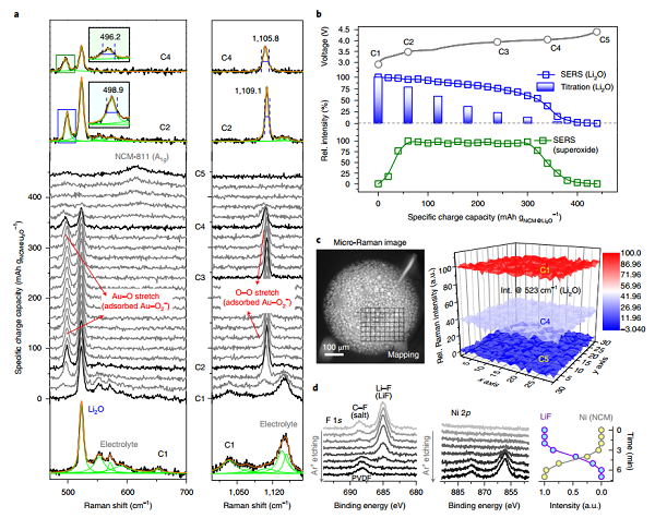 图B. 从a图所示的原位表面增强拉曼光谱中获得了523 cm-1(中板)和~1108 cm-1(吸附O2–,底板)的拉曼峰强度与容量的关系。顶板显示了NCM@Li2O阴极在10 mA gNCM-1电流密度下初始充电过程的恒流电荷曲线。电荷曲线上标有5个点:C1:原始的;C2:60mAh g-1;C3:240 mAh g-1; C3:240 mAh g-1; C4:340 mAh g-1。