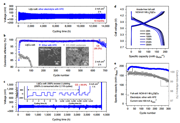 图2|纽扣电池中锂金属电镀/剥离可逆性和初始无阳极全电池循环性能的评估。(用含HFe添加剂(体积分数为10%)的双盐G3基电解液组装的Li||Li对称电池和Li||Cu半电池进行实验)