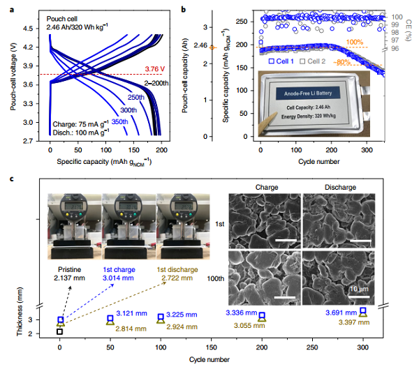 图5|320 WH kg-1初始无阳极锂电池的性能。