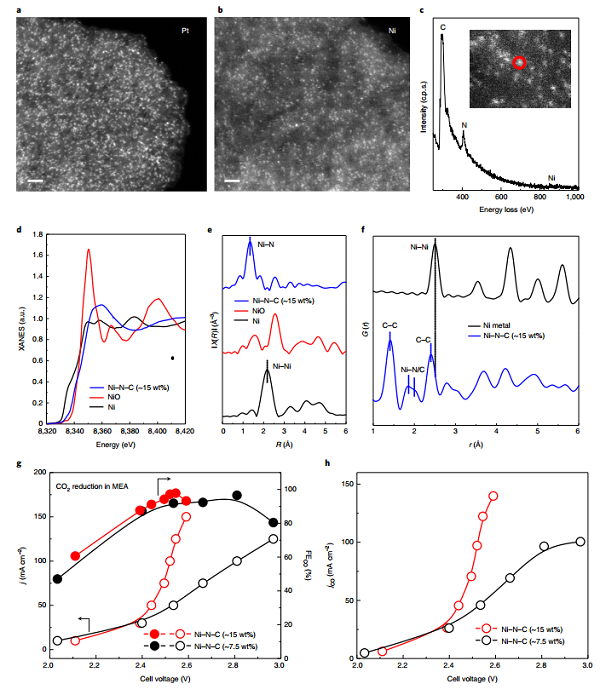 图C:孤立镍位置的STEM–EELS谱(插图中以红色圈出),表明镍和氮在碳载体上共存。