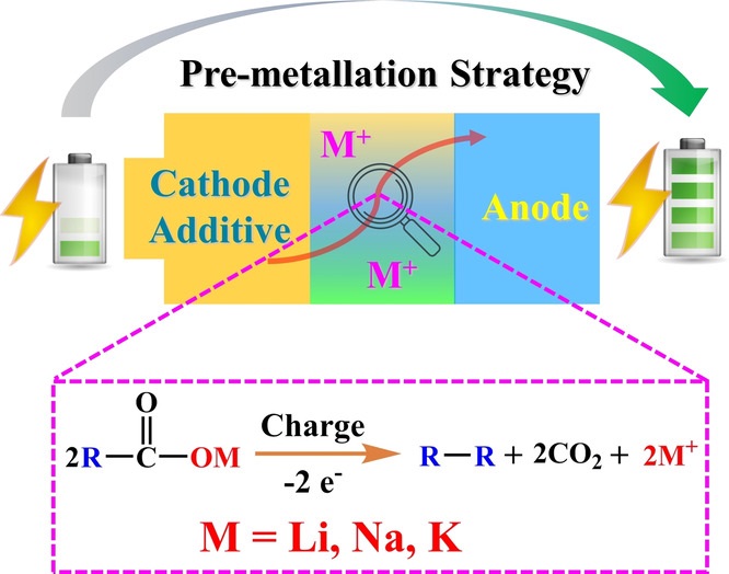 预金属化被认为是金属离子的预掺杂,代表着在电化学储能(EES)系统中增加额外的源以实现足够的金属含量。需注意,预金属化处理是一个必不可少的步骤,在各种EES系统中至关重要。在可充电金属离子电池(MIBs)中,电池型正极活性金属源的含量在很大程度上决定了电池的能量密度。因此,预金属化处理可以有效地补充失去的活性金属含量,进一步保证最大容量。同时,由于多孔碳正极不含活性金属源仅表现出物理吸附/解吸行为,因此必须完成金属离子电容器(MICs)的预金属化过程,可以增大体系的工作电压,降低长循环过程中的电解液消耗。除上述优点外,预金属化技术还可以解决高活性碱金属引发的安全问题,是推动EES器件商业化的关键。在电解液中与碱金属直接接触的预掺杂方法简单有效,但其操作程序必须在惰性环境手套箱中进行,以避免碱金属的高反应性引发的本质安全问题。而恒定电流充/放电的电化学策略,通过操作时间或电位来控制预金属化程度,但是需要额外的拆卸和组装程序,使得过程复杂和费用高昂,严重阻碍了EES器件的商业化。虽然研究人员研究并报道了多种预金属化试剂,但由于缺乏理论指导,目前的预金属化技术受到严重限制。此外,分解电位的精确调节仍是正极添加剂发展的一大障碍,亟待解决。