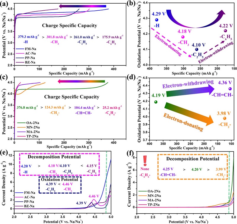 (a)四种单钠羧酸盐在电流密度为0.1 A g-1时的恒电流电荷分布;