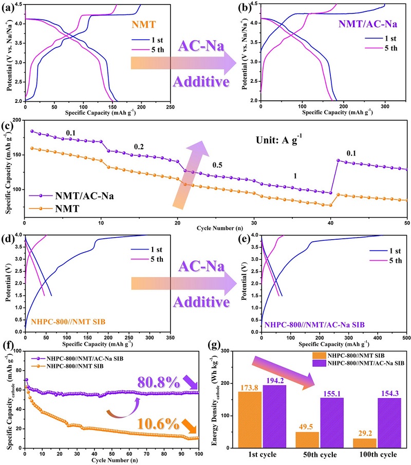 图五、NHPC//NMT和NHPC//NMT/AC-Na SIBs的性能