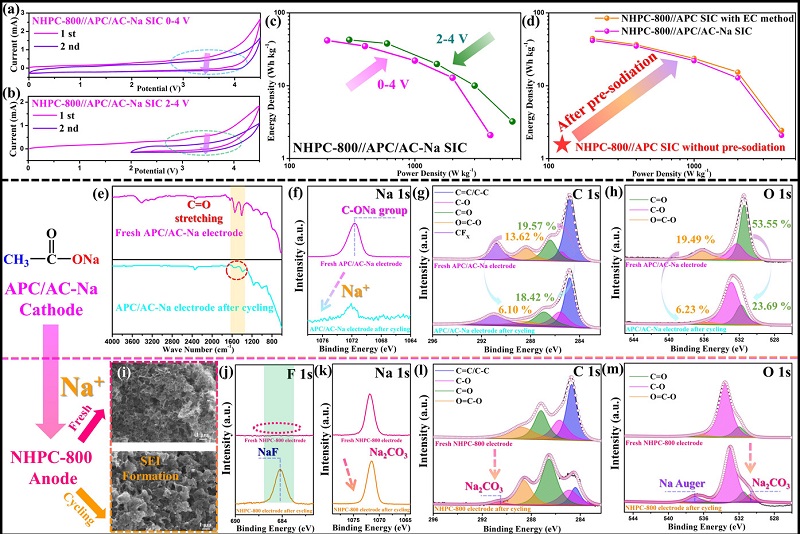 (d)比较未预钠化的NHPC-800//APC SICs和不同预钠化方法下NHPC-800//APC SICs在0-4 V下的性能;