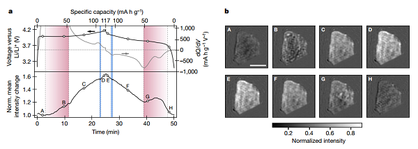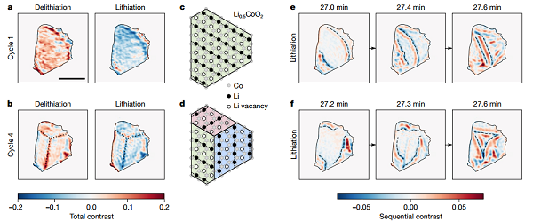 图E和F:过渡期间第1周期(图E)和第4周期(图F)的差异图像导致锂化时发生锂的无序现象。顺序对比度(色阶)是通过将像素强度值除以5秒之前的值,然后减去1来表示该时间刻度上的强度变化而获得的。