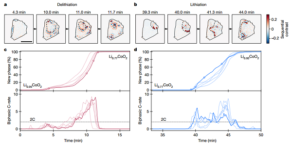 图A和B:在双相转变(第4周期)期间,脱锂(图A)和锂化(图B)时活性颗粒的连续差分图像。黑色虚线是代表相位边界位置。顺序对比度(色阶)是通过将像素强度值除以20秒前的值然后减去1来表示该时间尺度上的强度变化而获得的。