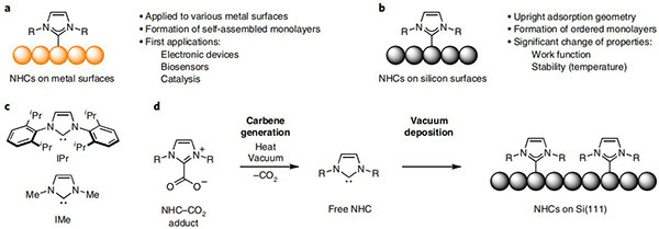 自首次被成功分离以来的三个十年中,N-杂环碳烯(NHCs)作为一种具有发展前途的表面功能化改性剂和锚定剂,与基于硫醇的体系相比具有一些优势。由于其强大的结合亲和力和高的给电子能力,NHCs可以显著改变它们所结合的表面的特性。迄今为止,在除贵金属以外的表面吸附NHCs已经很少被研究,高度有序的NHCs单分子层仅限于金属表面。然而,随着半导体产业的发展,硅仍然是半导体器件中的首选元素,因此硅表面的改性以增强从光伏器件中有机分子收集对发展电子工业至关重要。为此,使用NHCs作为进一步功能化的锚定剂,同时也作为电子和空间可调配体,可能是一种很有前景的方法。到目前为止,只有一项关于NHCs在硅表面吸附的详细研究,研究者研究了各种NHCs在以H为末端的硅上的吸附,并发现插入Si-H键后,形成H-C-Si键。