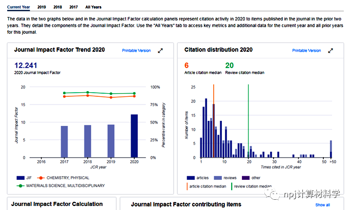 npj Computational Materials期刊由中国科学院上海硅酸盐研究所与英国自然出版集团(NPG)以伙伴关系合作出版的完全开放获取的国际学术期刊。发表各种基于理论指导、设计的材料学和计算模拟并实验合成的材料学领域原始数据论文、综述文章、社评。期刊最新的影响因子12.241,较去年的9.341有了较大幅度的增长,2020年总被引频次为4355,材料科学和物质化学类细分领域中均为Q1区期刊。