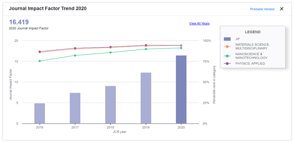 Nano-Micro Letters(《纳微快报》)是上海交通大学主办、上海交通大学出版社有限公司出版、Springer Nature合作出版的开放获取期刊。主要报道与纳米/微米尺度相关的高水平研究成果、综述、评论及展望等类型的文章。2020JCR影响因子:16.419,同时五年平均IF也高达14.248。在物理、材料、纳米3个细分领域内位列 Q1 分区,均位于分区前10%,其中在Physics, Applied 排名 10/160 ;Materials Science, Multidiscplinary 排名 19/335 ;Nanoscience & Nanotechnology 排名 10/107 。