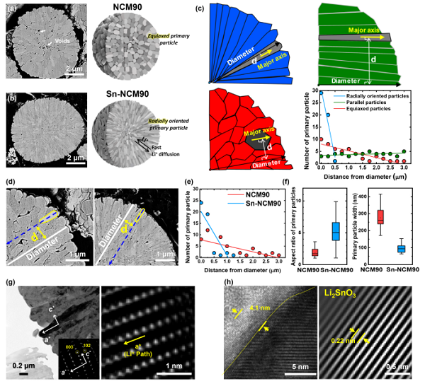 (a) NCM90和(b) Sn-NCM90阴极颗粒的横断面扫描电镜(SEM)图像和原理图。(c)一次粒子径向垂直距离(径向取向、平行和等轴取向)的模型和假设分布。(d)扫描电镜图像测量垂直距离。(e) NCM90和Sn-NCM90一次粒子垂直距离的分布。(f)一次粒子的长径比和宽度。(g) Sn-NCM90表面一次粒子的扫描透射电子显微镜(STEM)图像和相应的选定区域电子衍射图形(插图)。(h)高分辨率(HR)透射电镜图像与相应的傅里叶变换图像的Li2SnO3涂层。