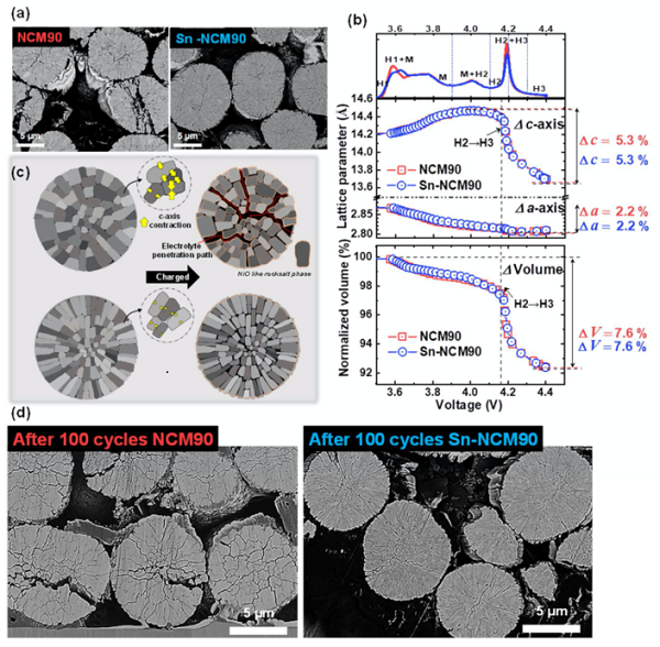 (a)充分充电的NCM90和Sn-NCM90在4.4 V和第一个周期的横断面SEM图像;(b) NCM90和Sn-NCM90的晶格参数与截止电压的关系;(c) NCM90和Sn-NCM90一次粒子的微裂纹特征示意图;(d) NCM90和Sn-NCM90在2.7 ~4.4 V(放电状态)循环100次后的横断面扫描电镜图像。