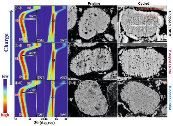 为了找出P-LNCM和B-LNCM循环稳定性提高的原因。采用原位XRD监测了充电过程中的相变和结构变化。在第一次充电时,(003)H1峰不断向低2θ转移,直至充电到4.1V时, (003)H2峰逐渐形成。在(003)峰向低角度的转移过程中,由于锂离子脱出,相邻O原子层间的静电斥力作用增强,锂离子层间距离增大。继续充电至4.4V,U-LNCM,P-LNCM和B-LNCM的(003)峰均迅速向更高的2θ方向移动,c轴方向层间距离骤然减小。H2-H3相变过程,三个样品的(003)峰分别偏移1.06°, 1.04°和1.03°。这一结果表明,磷或硼在晶格上的掺入并没有明显减缓充电过程中与相变相关的内在结构变化。然而,在循环后的FIB-SEM图像中可以清楚地看到P和B掺杂的有益效果。50次循环后U-LNCM中,二次颗粒内部形成了大量的微裂纹,部分裂纹贯穿整个颗粒,说明U-LNCM中随机取向的一次颗粒并不能缓解内部应力,避免裂纹的形成和扩展。相比之下,P-LNCM和B-LNCM在循环过程中没有发现可见的结构损伤,结构完整性保持良好,这表明径向有序排列的一次颗粒结构具有优越的结构稳定性。