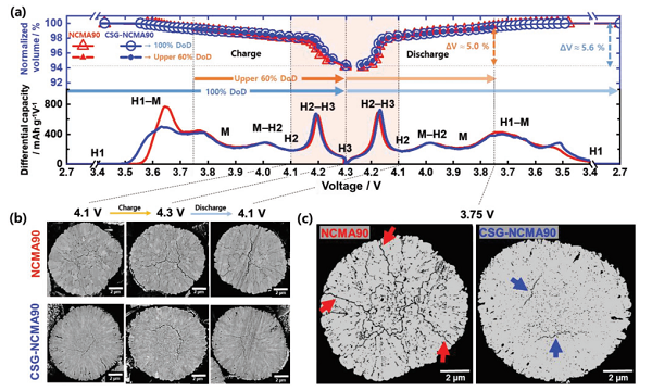 a) NCMA90和CSG-NCMA90正极电池的首圈充放电曲线的dQ dV-1曲线和相对应的原位XRD晶胞体积变化。b) NCMA90和CSG-NCMA90在不同充放电状态下(首圈充电到1、4.3 V,再放电到4.1 V)的扫描电镜横断面图像。c) NCMA90和CSG-NCMA90放电到3.75 V的裂纹分布图。