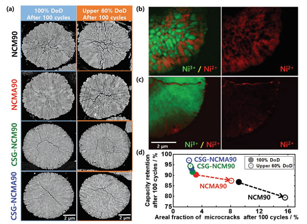 a) NCM90、NCMA90、CSG-NCM90和CSG-NCMA90在100% DoD和60%以上DoD下循环100次后的扫描电镜横断面图像;b) NCMA90和c) CSG-NCMA90在100% DoD下循环100次后的截面Ni价态的分布图(红色和绿色分别代表Ni2+和Ni3+)。d)在100% DoD和60%以上DoD下循环100次后,微裂纹面积分数与正容量保留的关系。