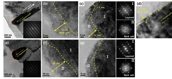 CSG-NCMA90在100% DoD下循环1000次(a-d)和100% DoD下NCMA90循环500次的TEM图像(e-g)。a)一次粒子TEM图像和相应的SAED图 (插图):b) Li+离子扩散的边缘;c) I和II区域的TEM图和傅里叶变换图;d)侧面;e)一次粒子TEM图像和相应的SAED图案(插图)。(e)图中标记的区域: f)边缘标记区域的高分辨率透射电镜图像和g)区域I和II的SAED模式。黄色虚线为层状相和岩盐相的分界线。