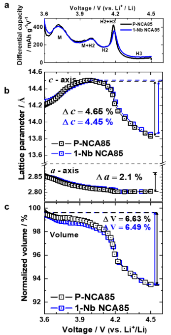 a) P-NCA85和1-Nb NCA85第一次充放电循环dqdv-1曲线图。b) P-NCA85和1-Nb NCA85晶胞参数和晶胞体积随电压变化的原位XRD图